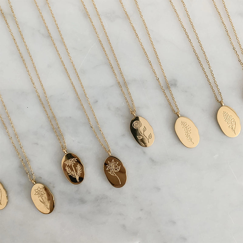 The Birthflower Necklace features 12 different meaningful flowers. Each flower on the pendant of this necklace symbolizes a different month, wear your personal story and choose the flower that is most important to you.