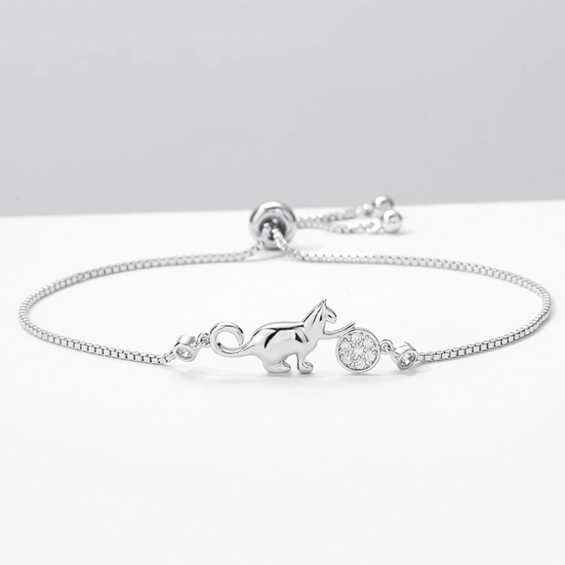 Fashionable silver bracelet with adorable cat playing - suitable for any occasion and versatile outfit combinations to match.