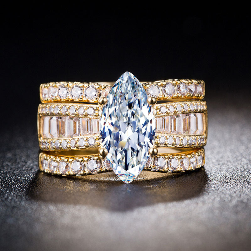 This elegant ring set features a marquise cut stone at the center, while sparkling princess cut stones set across the center of the shank. Borders of smaller round stones grace the top and bottom of the shank, completing this exceptional design.