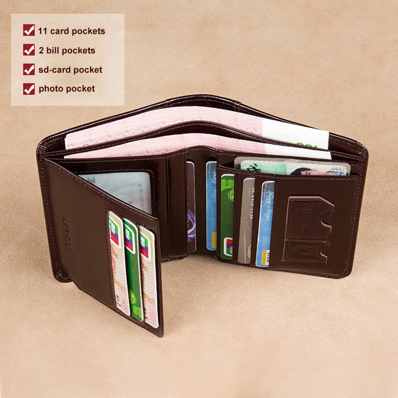• PLENTY OF ORGANIZED STORAGE: Each mens wallet features; 11 roomy card slots, 2 sleek ID windows, 2 slip pockets plus a spacious inner compartment for paper money & more.