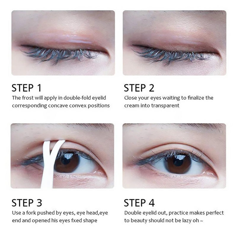 Using our invisible eye cream, just apply it to your eyelids, wait for a minute, and use our y-shaped tool to deepen the lines and make your eyelids more natural and attractive. -