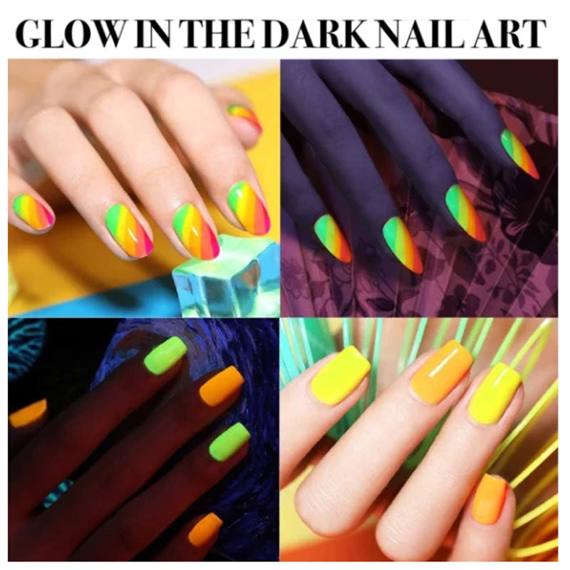 Comes with a set of 12 vibrant neon shade with luminous effect, take your nail art to the next level with a spectacular light-up look in the dark! Cast a striking glow at night, let you shine with eye-catching nails in both daytime and fluorescent effect.