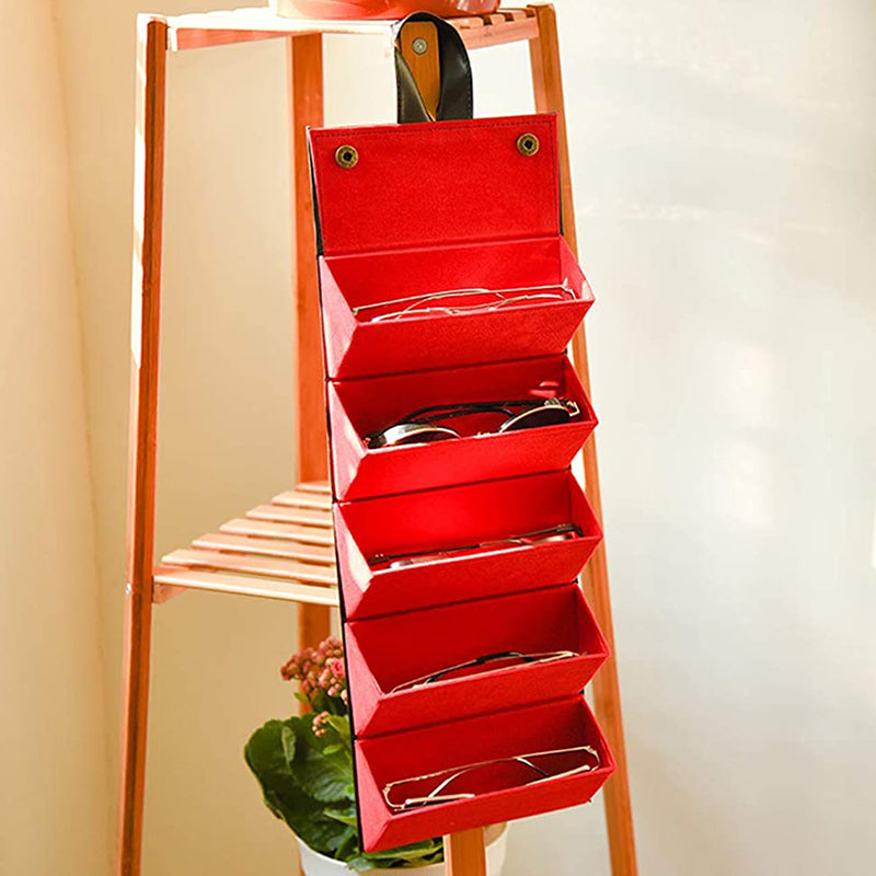It can store 5 pairs glasses in one convenient and unique design case. You can hanging it in closet or put it on the dresser.