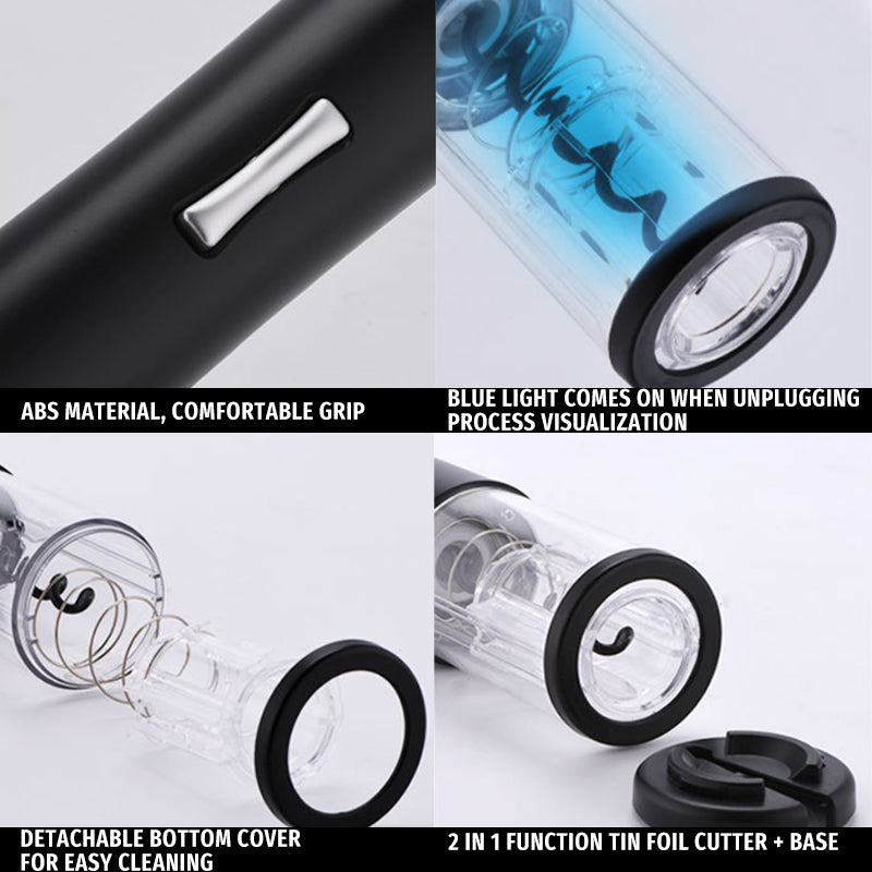 With foil cutter - Foil cutter is easily to removing seals. It can be installed on the bottom of the electric wine bottle opener for convenient storage when not needed.
