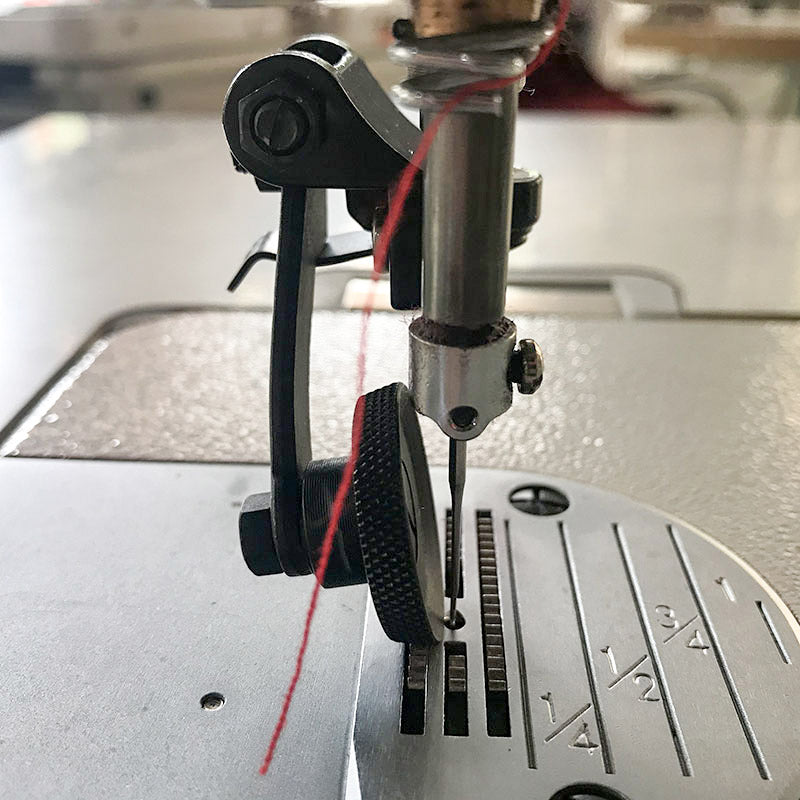 - Attach Leather Roller Presser Foot to the machine; adjust the needle position to the far left to sit next to the wheel of the foot.
