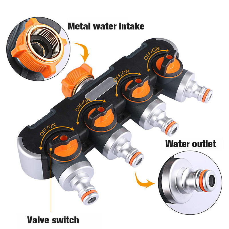 - 4-WAY CONNECTOR ADAPTER - The high-performance hose splitter has 4-way connections, with which 1 spigot can be converted into 4 high-flow water sources. Creatively build an effective irrigation system and improve your use of cones, conveniently and practically.