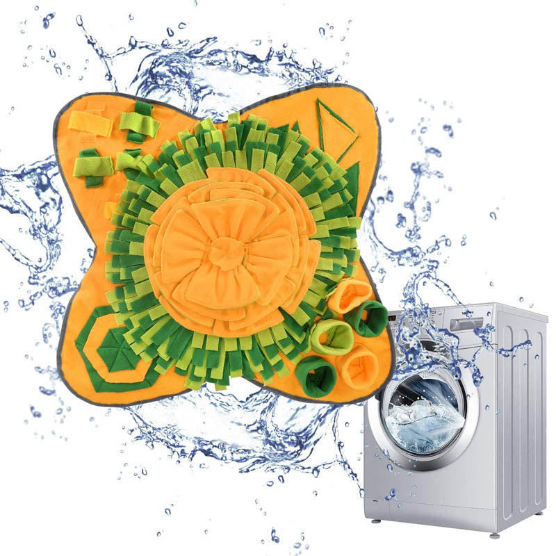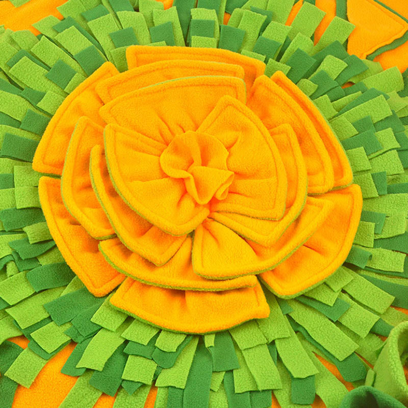RICH FEEDING GAME – Look at the Big Orange Flower in the middle of the snuffle mat. Total 4 layers of orange petals can hide large chunks of food easily. Outer ring of the rich and messy grass suitable for small size of food.